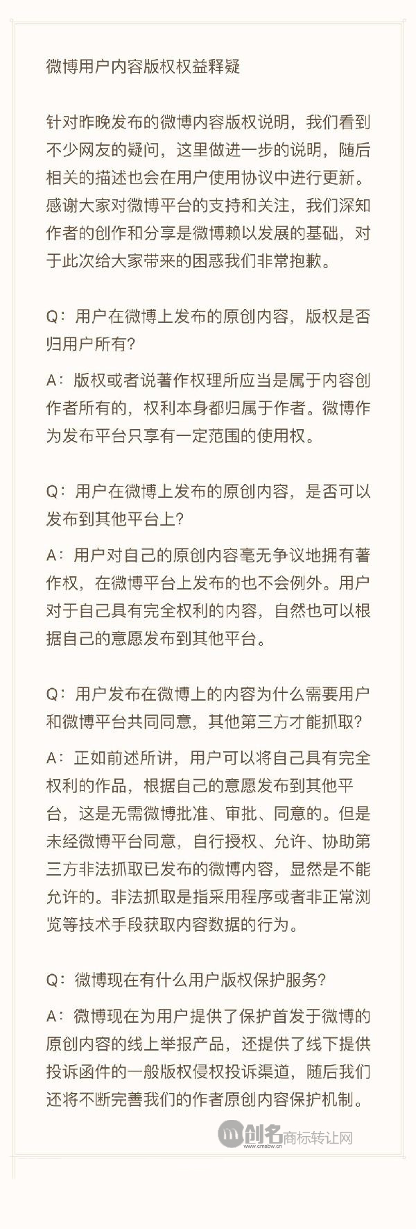微博連夜發(fā)公告修改協(xié)議中不恰當(dāng)?shù)谋硎?,并?0多個(gè)小時(shí)后再次發(fā)公告釋疑和道歉,稱(chēng)用戶(hù)對(duì)自己的原創(chuàng)作品毫無(wú)爭(zhēng)議地?fù)碛兄鳈?quán),該條款僅針對(duì)未經(jīng)微博平臺(tái)同意的第三方非法抓取行為。此外,微博也表示,上線了保護(hù)首發(fā)于微博的原創(chuàng)內(nèi)容的線上舉報(bào)產(chǎn)品,將不斷完善作者原創(chuàng)內(nèi)容保護(hù)機(jī)制。