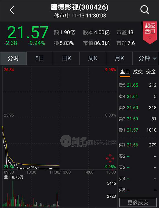 11月13日,唐德影視股價(jià)逼近跌停。